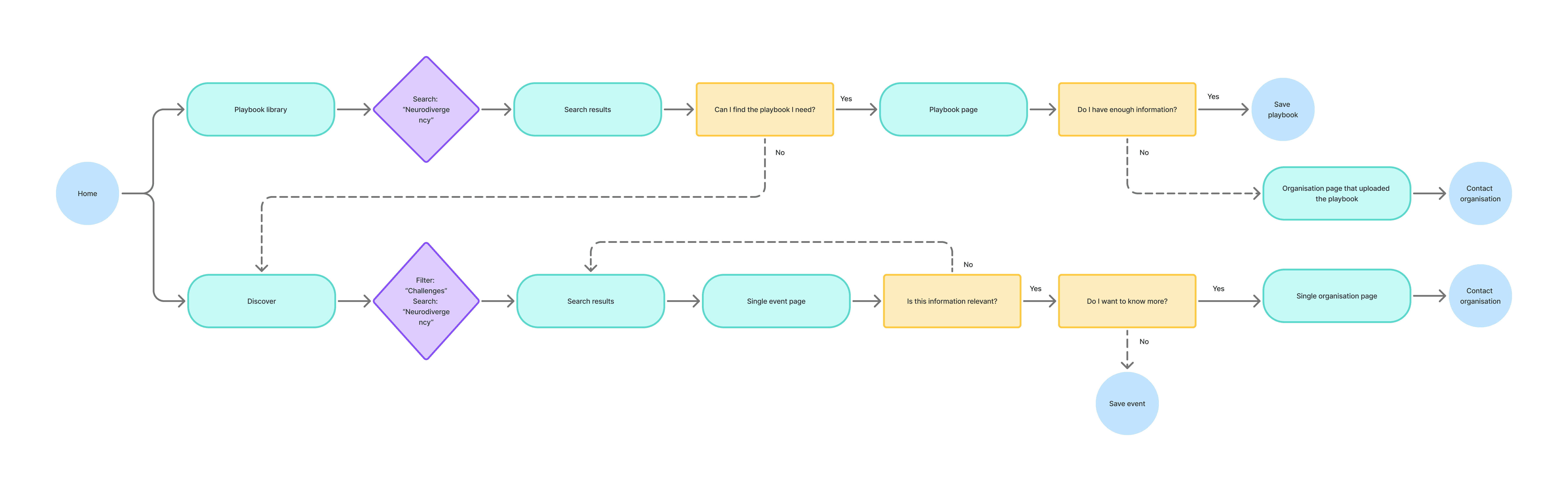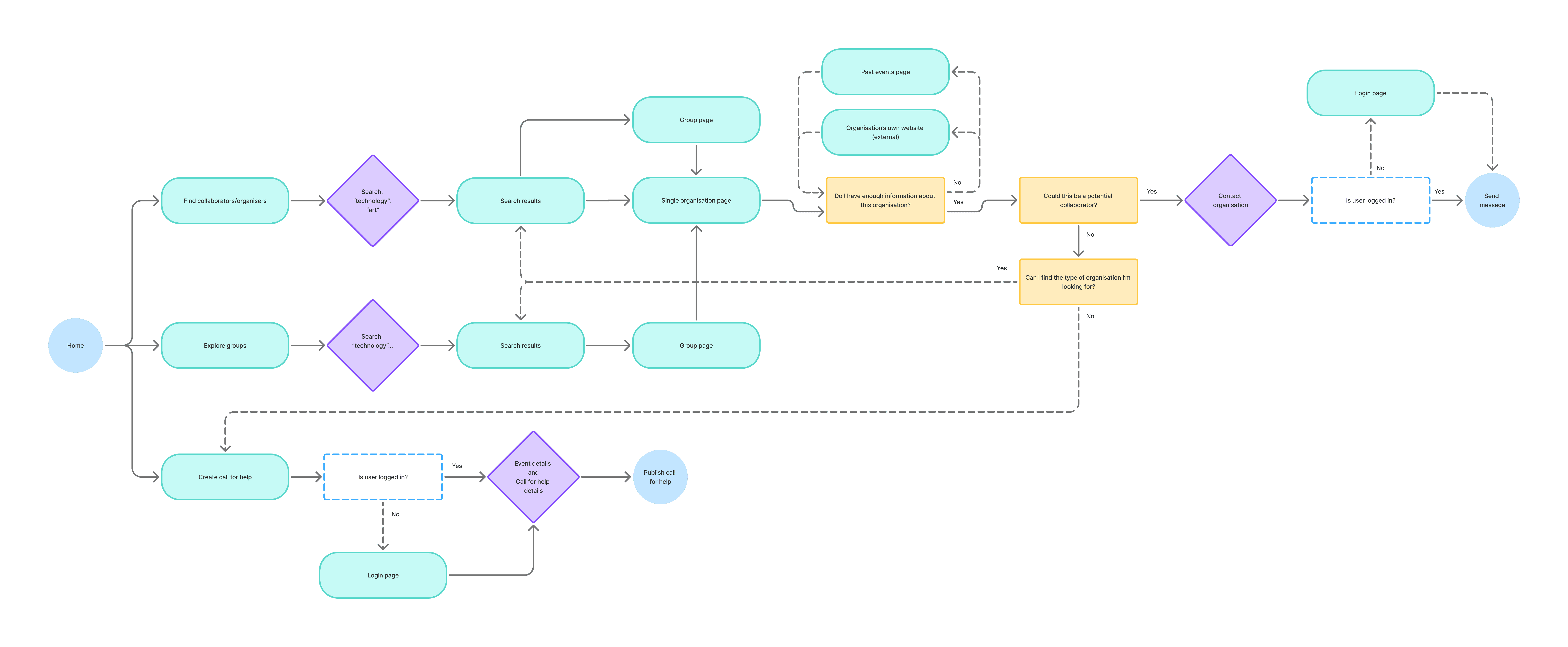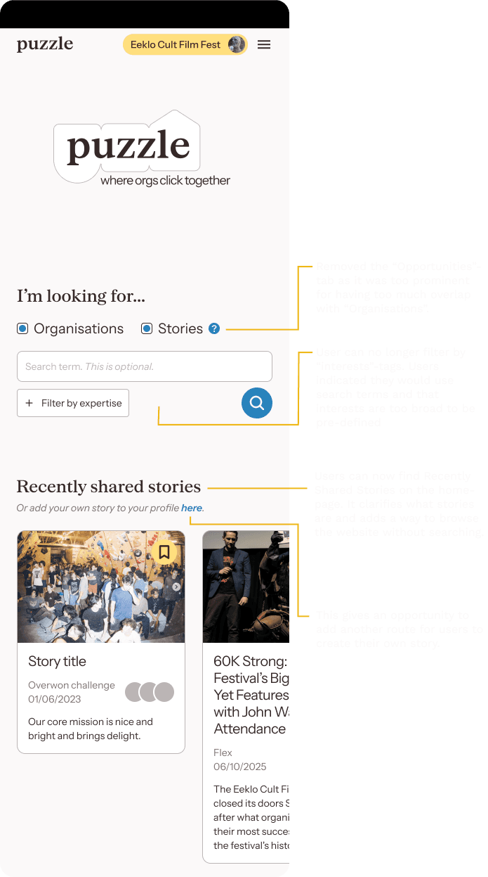 But mapping user flows revealed a consistent endpoint: contacting another organisation. Events, calls for help, groups, and the playbook library all served the same purpose: helping organisations build credibility through sharing experiences to encourage contact. These three features were consolidated into one: stories.