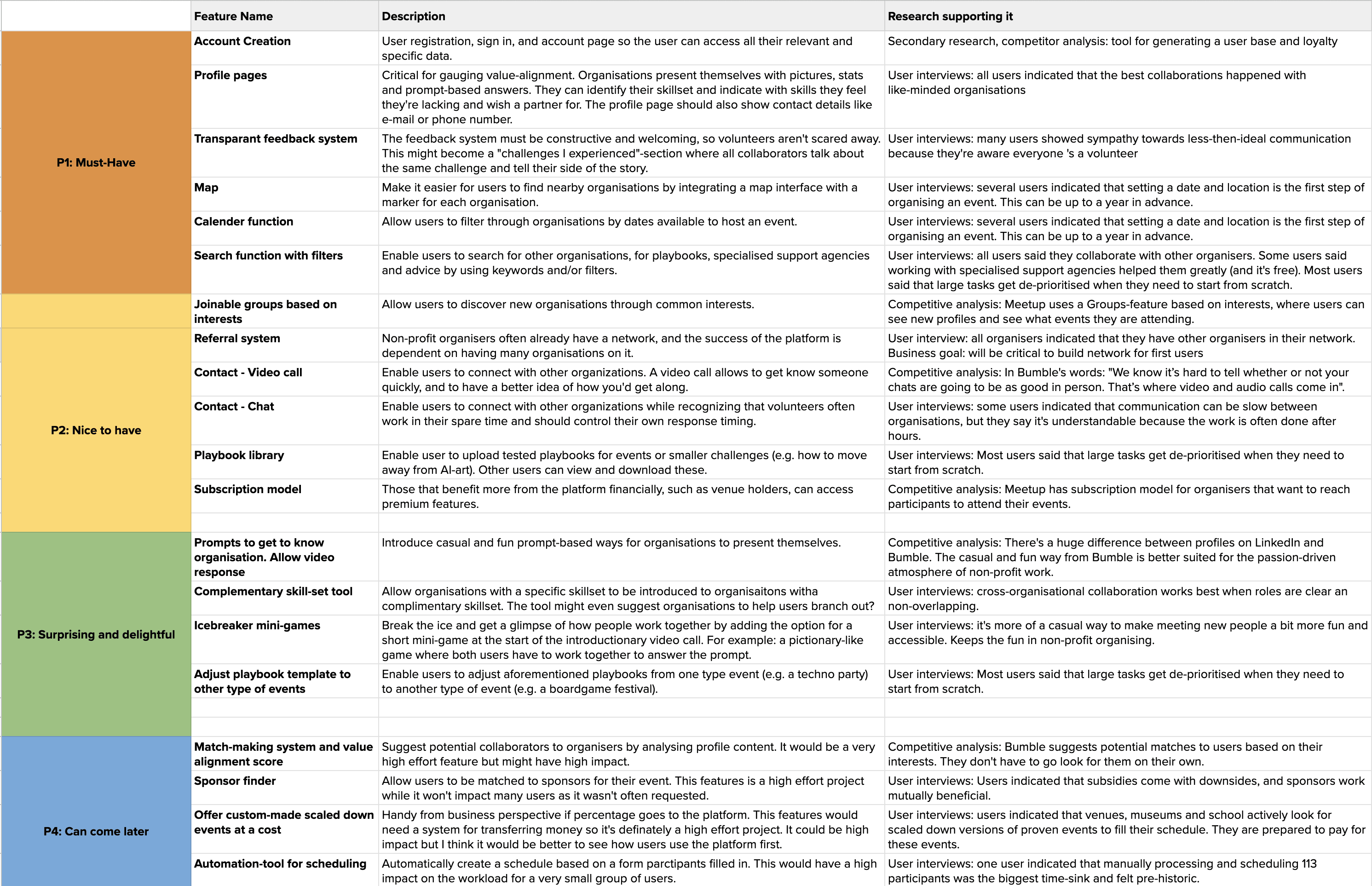 Starting from the viewpoint of the persona’s, I compiled a list of desired features. They’re listed by priority in the feature roadmap.