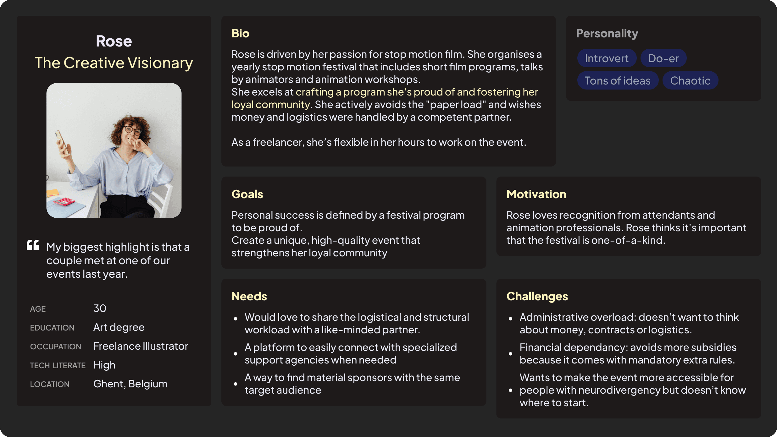 User flow 02: Rose is organising a stop-motion film festival and wants to make her event more accessible for neurodivergent visitors.