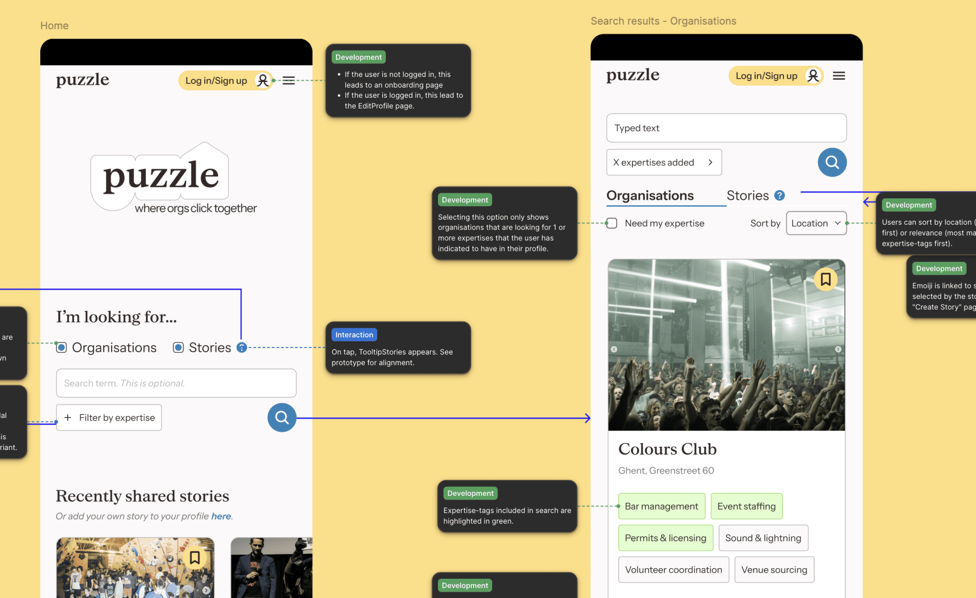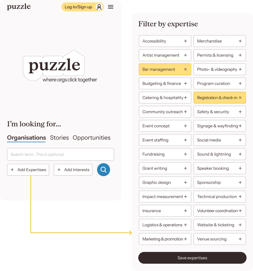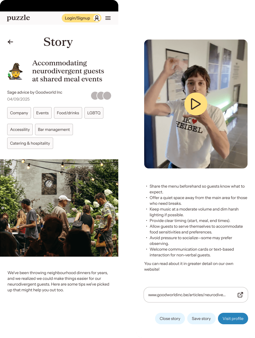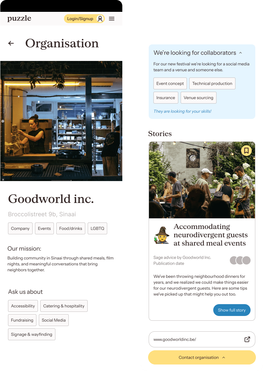 Listing expertises can make profile pages look like a job-platform. To avoid this, the lay-out is instead inspired by the casual profiles on dating-apps like Bumble: organisations present themselves using prompts and anecdotes (stories).