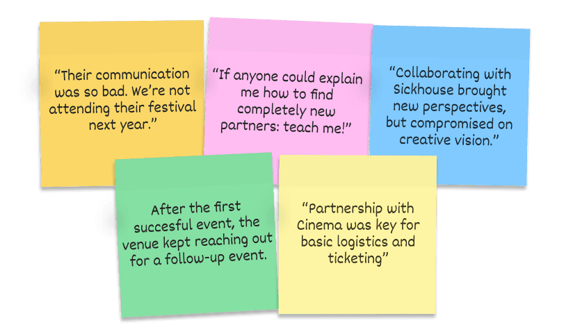 Multi-perspective event stories as soft reviews Collaborations don't always go smoothly, but a cold review system could sour the vibe of the platform. I wanted to explore an extension of the stories-feature where multiple organisations write about the same event from their perspectives. Viewers would see complementary angles, each organisation sharing insights from their specialised role. It would be an anecdotal take on the review, without the negativity of star ratings or public complaints.